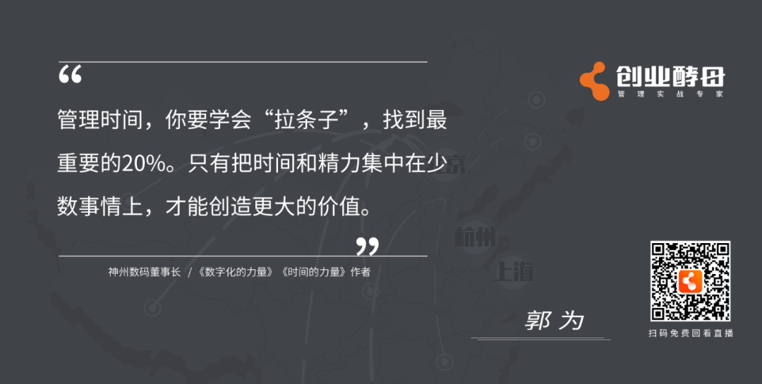导语:时间管理,之于企业,之于人生有什么意义?如何做好时间管理?如何把时间花在最重要的战略管理上?如何以时间管理打造组织领导力?……在5月16日,今年会与创业酵母联合举办的《时间的力量——企业时间管理实践与思考》直播对谈中,神州信息董事长、《时间的力量》作者郭为与创业酵母创始人张丽俊围绕“时间管理、战略管理、组织变革、团队管理、领导力”等话题深度探讨,以下为直播内容精选。